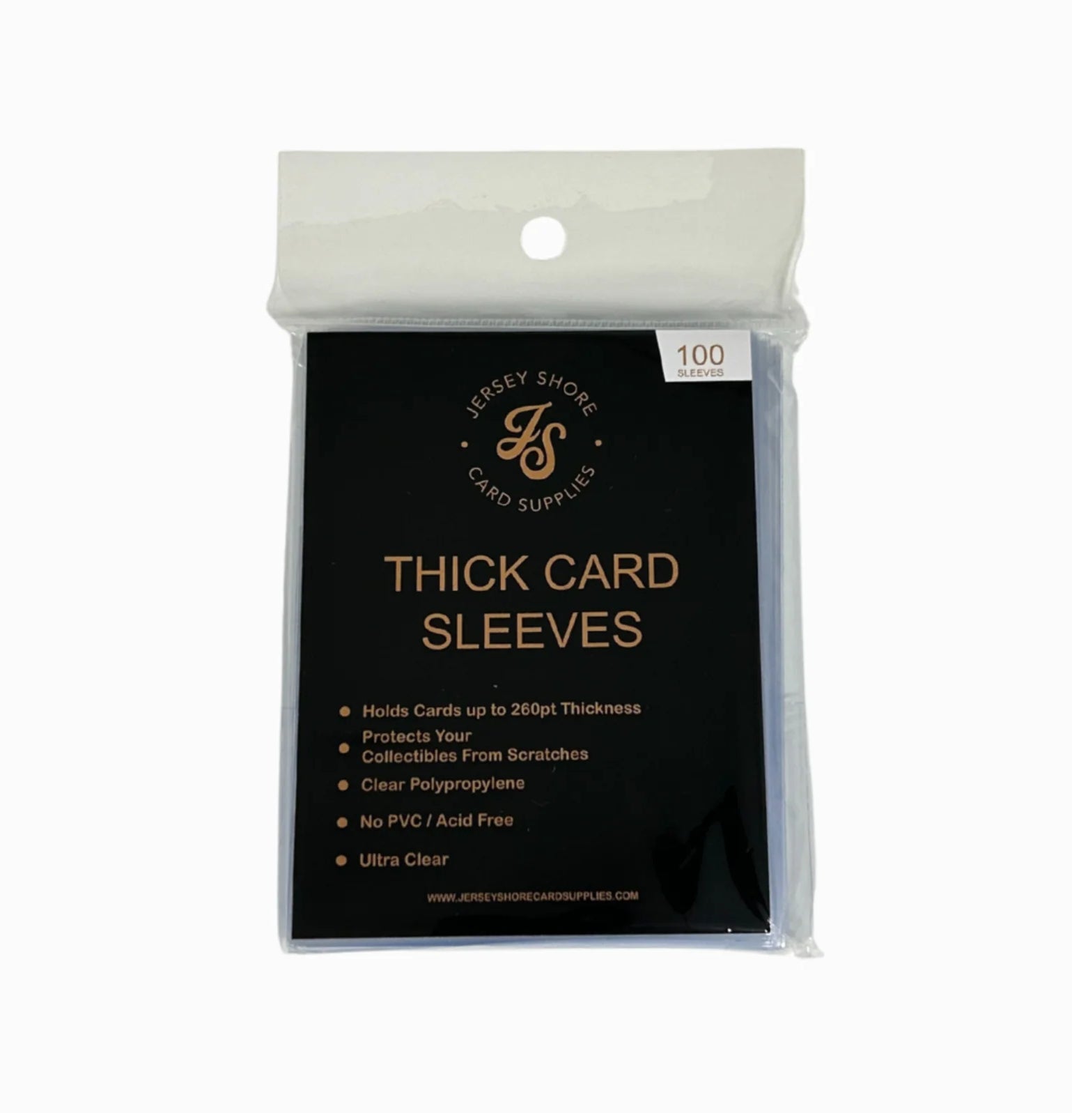 Thick Card Penny Sleeves from Jersey Shore Card Supplies are made with non-PVC, acid free, clear polypropylene film. These soft sleeves are designed to protect trading cards from dust, dirt, oils, scratches and more. Thick size sleeves can fit cards from 100-260pt. in thickness. 100 sleeves per package.